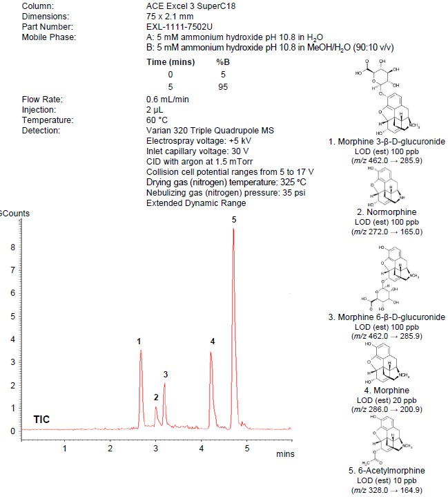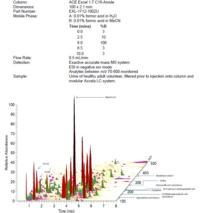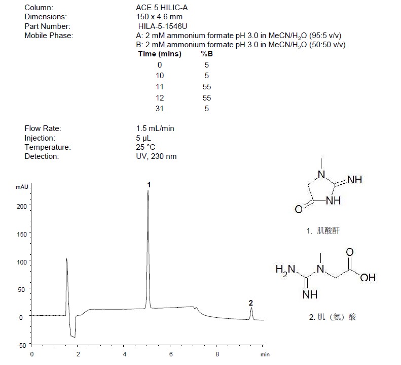 針對不同酸堿性的化合物,ACE設(shè)計了三款HILIC柱(A,B和N),實現(xiàn)不同的選擇性。比如: