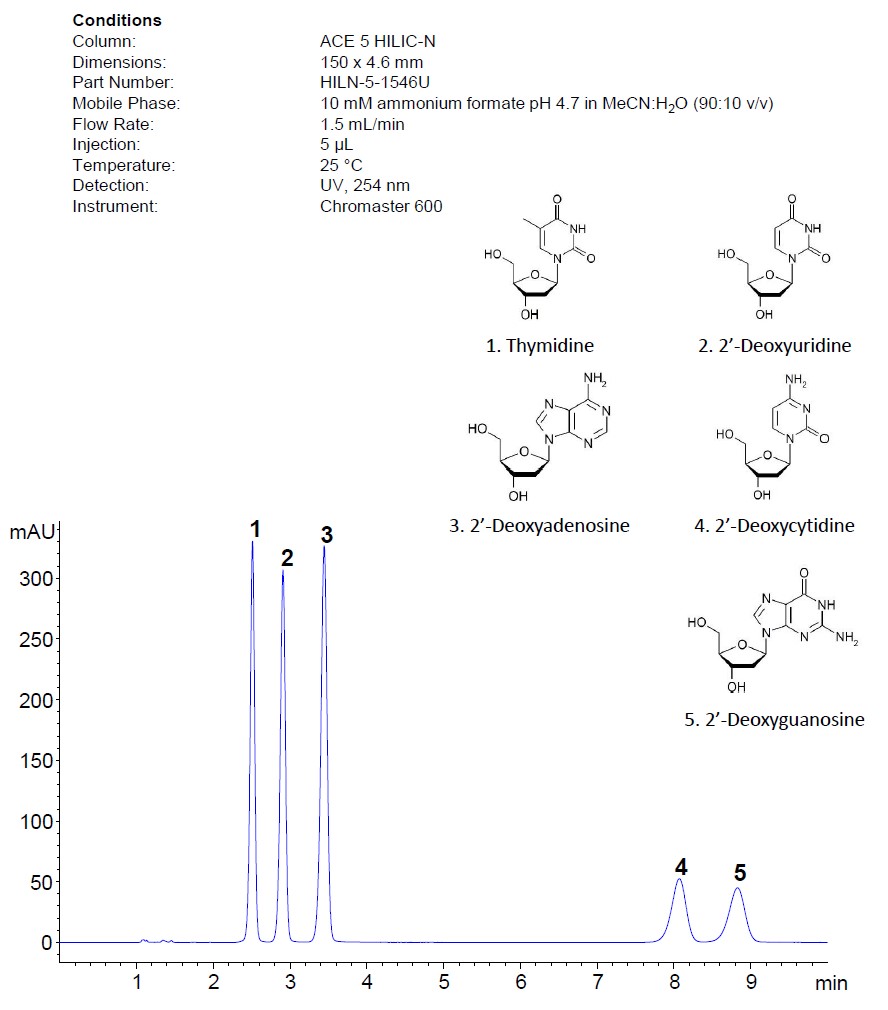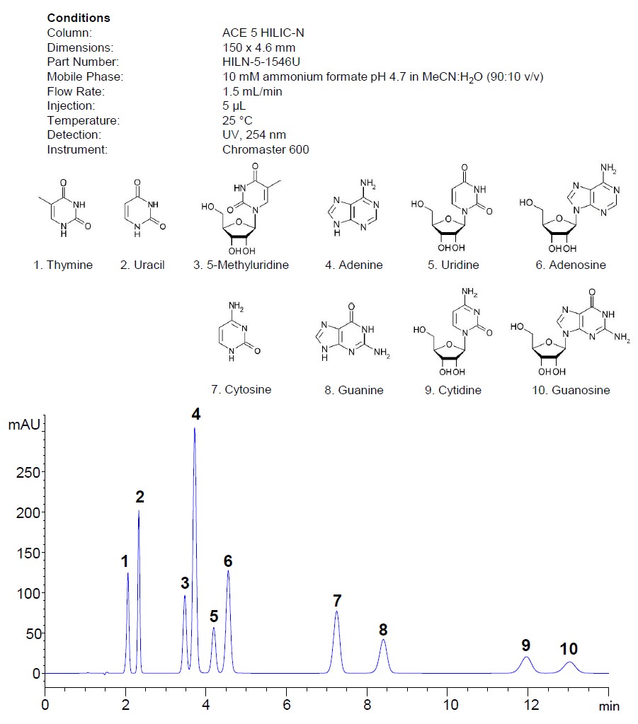 ACE HILIC-N是ACE三款親水作用色譜柱中的中性柱,相對(duì)于陰陽(yáng)離子都顯示出較低的離子交換能力,通過(guò)極性相互作用、吸附和一定程度的分散(分配能力)來(lái)保留分離核酸堿基、核糖核苷和脫氧核糖核苷。