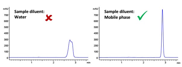 當使用親水相互作用液相色譜法(HILIC)時,樣品稀釋劑的選擇對峰形有顯著的影響。稀釋劑的錯誤選擇可能會導致色譜峰形差,峰分裂和保留時間的不穩(wěn)定。