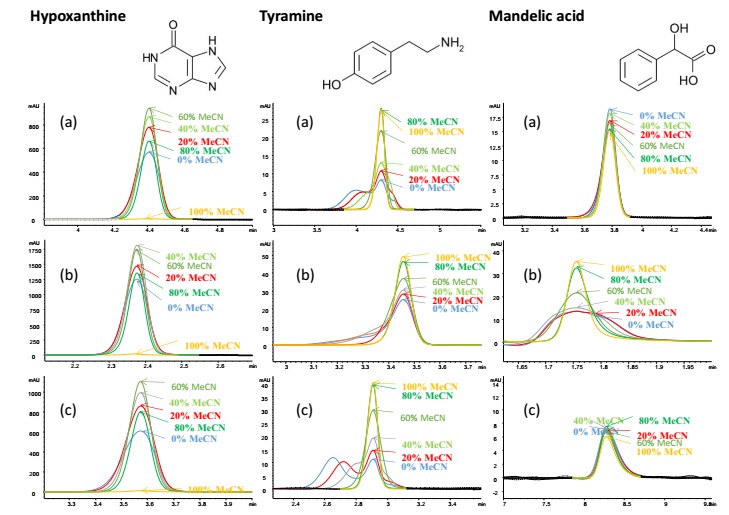 圖2:次黃嘌呤、酪胺和扁桃酸在(a)ACE 5 HILIC-N、(b)ACE 5 HILIC-A、(c)ACE 5 HILIC-B,150 x 4.6mm。在乙腈:水(90:10 v/v)甲酸銨調(diào)溶液pH 3.0。流速:1.5mL/min。溫度:25℃。檢測器:UV,254nm。進樣量:5uL。
