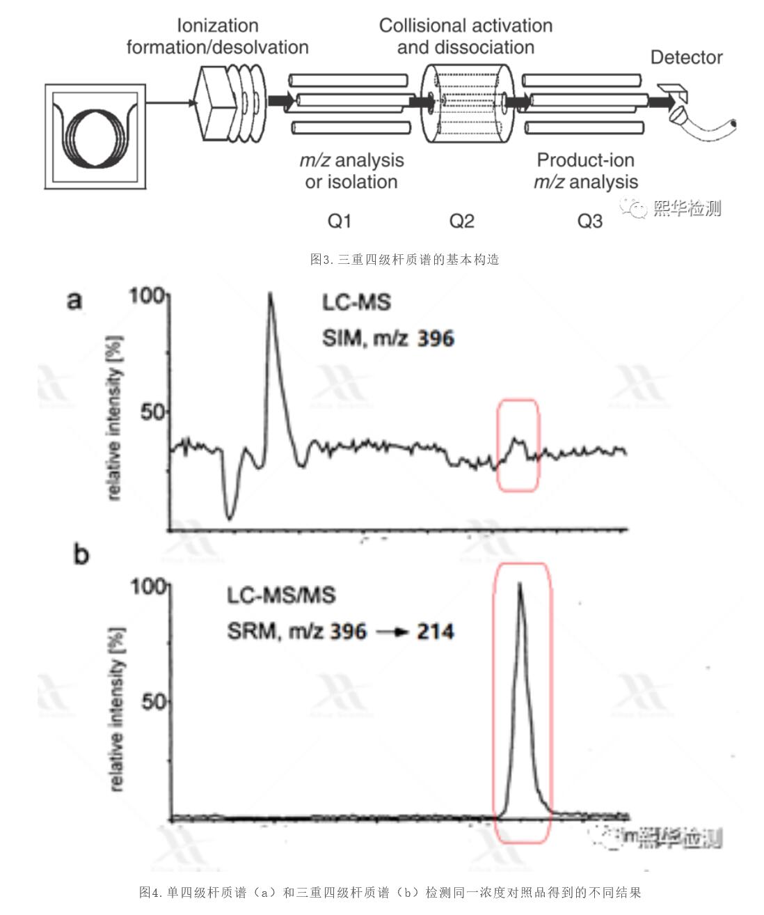 說(shuō)到定量,毫無(wú)疑問(wèn),還是應(yīng)該請(qǐng)我們分析定量界的王者-三重四極桿質(zhì)譜上場(chǎng)。雖然屬于低分辯質(zhì)譜,但由于其獨(dú)特的結(jié)構(gòu)設(shè)計(jì)(圖3),通過(guò)Q1篩選母離子,Q3篩選碎片離子來(lái)濾過(guò)干擾,大大降低了噪音信號(hào),提高了分析靈敏度(圖4)。