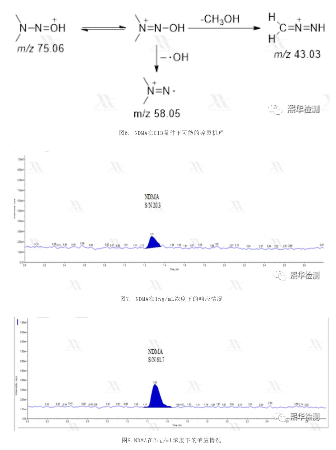 為了考察三重四極桿質(zhì)譜對(duì)NDMA的檢測(cè)能力,我們從幾臺(tái)API 6500plus液質(zhì)系統(tǒng)(市面上靈敏度和穩(wěn)定性最突出的三重四級(jí)桿質(zhì)譜)中隨機(jī)選擇了一臺(tái)并開(kāi)展了試驗(yàn)(圖5)。通過(guò)條件摸索,可知NDMA質(zhì)子加合物在常規(guī)CID(碰撞誘導(dǎo)解離)條件下,主要碎裂為m/z 43和m/z 58兩種碎片離子,推測(cè)其可能通過(guò)丟失甲醇分子以及羥基自由基【3】得到上述碎片(圖6)。鑒于該原理,我們使用m/z 43為定量離子,m/z 58作為定性離子。如圖7所示,使用FDA官方公布的液相條件,1ng/mL下NDMA對(duì)照品的信噪比為20.3,2ng/mL時(shí)為61.7,六針?lè)迕娣e的RSD為2.5%。在有雷尼替丁及其制劑加標(biāo)的情況下,回收率在90%以上,結(jié)果令人滿意。但另一方面,我們發(fā)現(xiàn)該方法的基線噪音異常地高。這也比較容易理解,因?yàn)镹DMA質(zhì)子化后,質(zhì)荷比只有75,非常容易受到空氣、溶劑以及緩沖鹽體系中小分子雜質(zhì)的干擾,導(dǎo)致噪音較大。