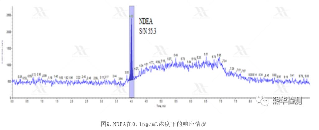 如上所述,三重四極桿質(zhì)譜對(duì)NDMA的檢測(cè)能力令人滿意,我們相信類似的方法對(duì)于NDEA的檢測(cè)效果會(huì)更佳。因?yàn)镹DEA的分子量為102,受低分子量區(qū)雜質(zhì)的干擾更小,理論上應(yīng)該有更好的靈敏度。如圖9所示,在0.1ng/mL濃度下,NDEA的信噪比達(dá)到55,證實(shí)了上述推測(cè)。