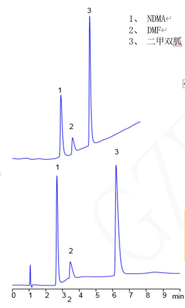 此方法流動相適合 MS 檢測器。很好解決了NDMA 與 DMF 的分離,避免DMF 對 NDMA 實際檢出量的干擾。樣品中的DMF 3mg/ml 濃度是為了在UV 檢測器下可以看 DMF。3u 150*3.0mm 或 3u 150*4.6mm是推薦使用的 MS 檢測器的規(guī)格,可以有更大的實際二甲雙胍進樣濃度,且把二甲雙胍的峰拉得更開。