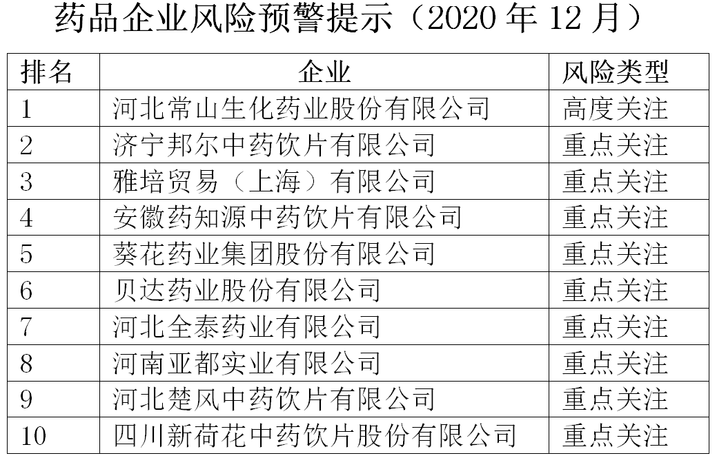 近日,中國健康傳媒集團(tuán)輿情監(jiān)測(cè)中心發(fā)布藥品企業(yè)風(fēng)險(xiǎn)預(yù)警提示(2020年12月),公開風(fēng)險(xiǎn)指數(shù)排名前十的企業(yè)。河北常山生化藥業(yè)股份有限公司(以下簡稱常山藥業(yè))排名第一,為“高度關(guān)注企業(yè)”;濟(jì)寧邦爾中藥飲片有限公司、雅培貿(mào)易(上海)有限公司、安徽藥知源中藥飲片有限公司、葵花藥業(yè)集團(tuán)股份有限公司、貝達(dá)藥業(yè)股份有限公司、河北全泰藥業(yè)有限公司、河南亞都實(shí)業(yè)有限公司、河北楚風(fēng)中藥飲片有限公司、四川新荷花中藥飲片股份有限公司分列第2至10位,為“重點(diǎn)關(guān)注企業(yè)”。