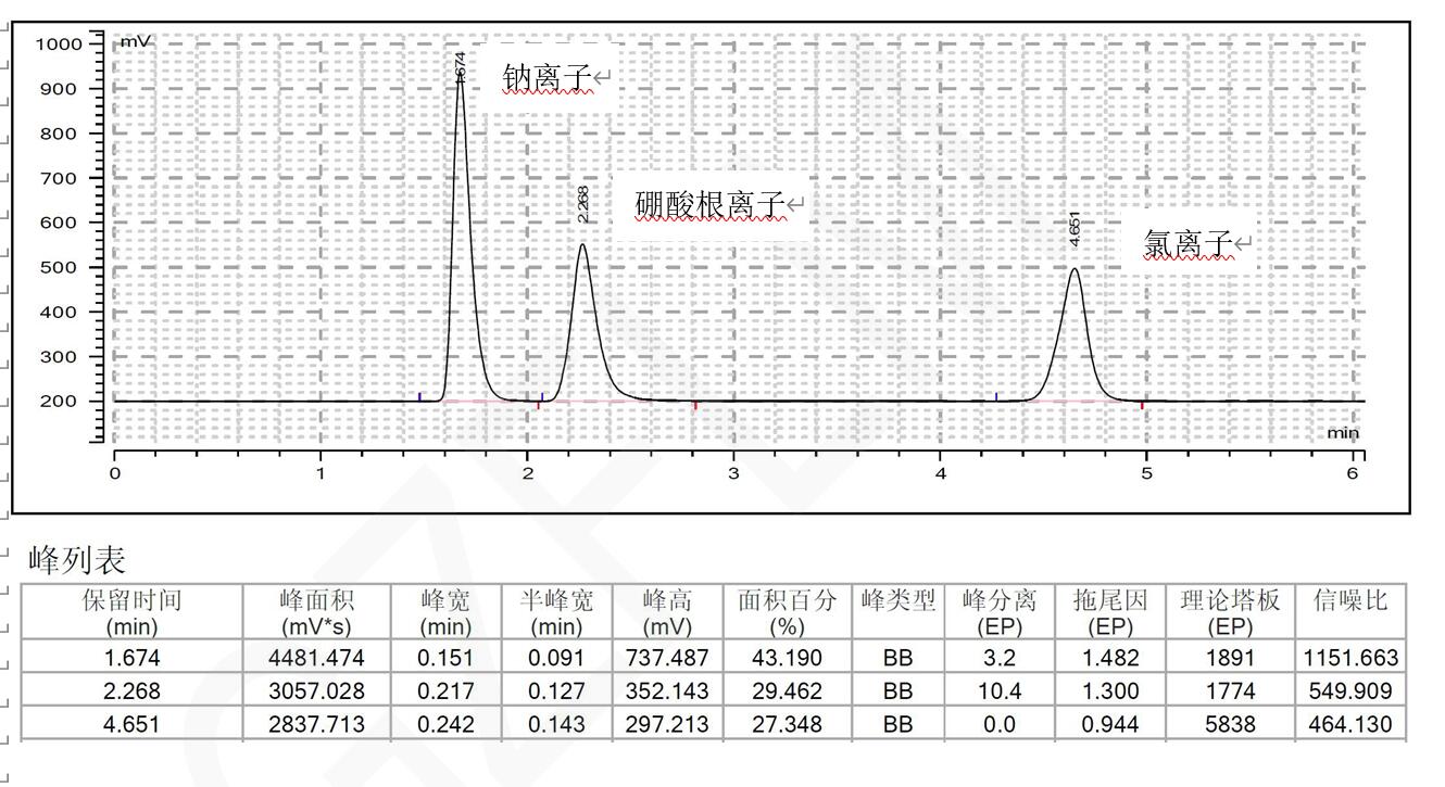 方法說明:使用 Comixsil RP-AX ,利用陰離子交換保留硼酸根離子和氯離子,鈉離子由于陽離子排