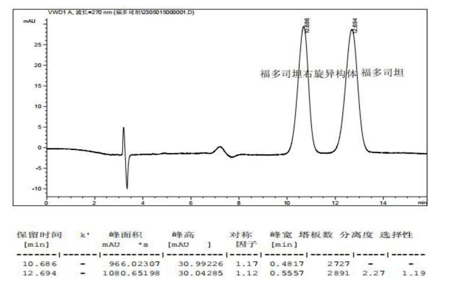 手性HPLC是目前最常用的手性分離方法之一。福多司坦及其右旋異構體可以被固定相為手性固定相的色譜柱有效地分離。手性固體相主要有兩種類型:手性小分子和手性高分子。