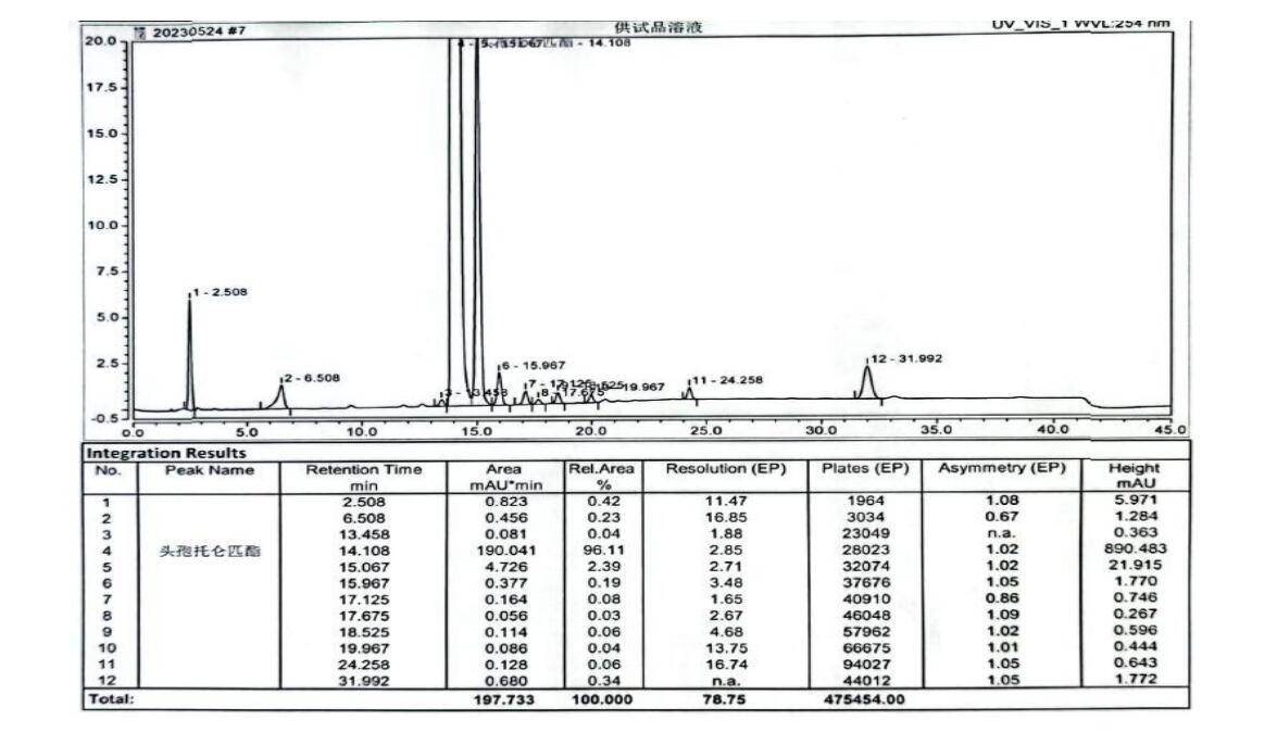 頭孢妥侖匹酯顆粒的檢測(cè)限為20 μg/ml,線性范圍為20-400 μg/ml,RSD不超過(guò)2%。該方法簡(jiǎn)便、準(zhǔn)確、靈敏度高,可以用于頭孢妥侖匹酯顆粒的質(zhì)量控制和分析。