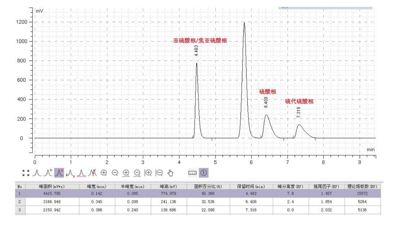 方法說(shuō)明:含硫原子的酸根通常酸性較強(qiáng),單純采用陰離子交換,較難洗脫且拖尾明顯;采用 Comixsil ACRP 的陰/陽(yáng)離子交換/排阻,可有效減弱保留,以此來(lái)改善峰型及保留;亞硫酸根及焦亞硫酸根等具有較強(qiáng)的還原性,在空氣中易氧化為硫酸根,從而影響定量的準(zhǔn)確性,在溶劑中加入 0.1%甲醛溶液作為抗氧化劑, 可有效抑制酸根的氧化,以此來(lái)滿(mǎn)足定量需求。