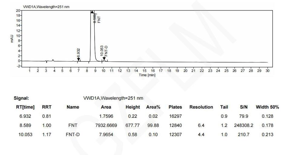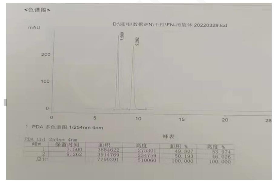 色譜柱 2:Chiral INC 3μm 250×4.6mm (FMG-JY3-I03) 流動相:反相(咨詢銷售代表) 流速:0.9 ml/min 進(jìn)樣體積:10 μL 檢測波長:251nm 柱溫:30℃
