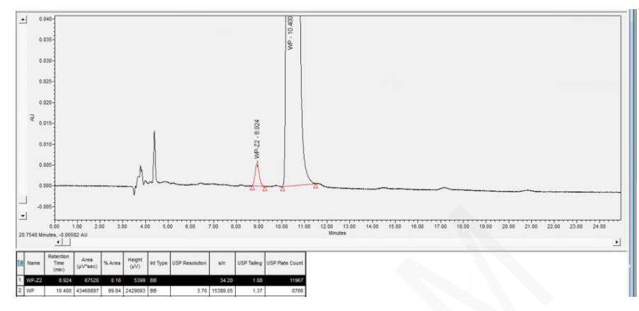 因此,為了確保烏帕替尼手性拆分的準確性和有效性,建議在專業(yè)的實驗室或藥物研發(fā)機構(gòu)進行,并由具有相關經(jīng)驗和技能的專業(yè)人員操作。這樣不僅可以確保拆分過程的順利進行,還可以保證拆分后得到的對映體的純度和活性滿足藥物研發(fā)和生產(chǎn)的需要。 App ID: FLM-B240004 烏帕替尼手性拆分 色譜柱:Chiral MZ(2)-RH 3μ 250*4.6mm (貨號:FMG-AC3-B02-R) 流動相:反相 (詳詢銷售代表) 流速:0.8 mL/min 檢測波長:230nm 柱溫:30℃ 樣品濃度:0.5mg/mL (異構(gòu)體含量約 0.1%以下和異構(gòu)體含量 0.15%) 稀釋劑(乙腈:水-30:70) 進樣量:10ul 色譜圖 1:(低于 0.1%限度)