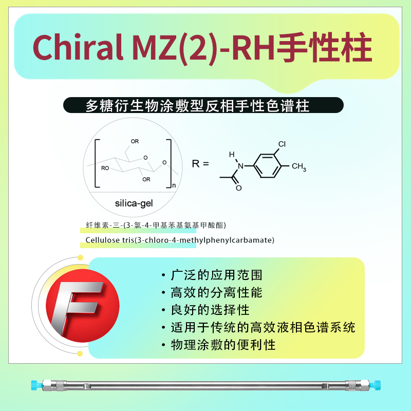 Chiral MZ(2)-RH反相手性柱特別適合于分析水溶性樣品或?qū)H值有特定要求的樣品。其固定相為纖維素-三-(3-氯-4-甲基苯基氨基甲酸酯),這種固定相具有獨(dú)特的手性識(shí)別能力,使得該色譜柱能夠有效地分離手性化合物中的對(duì)映異構(gòu)體。