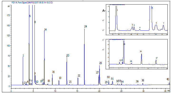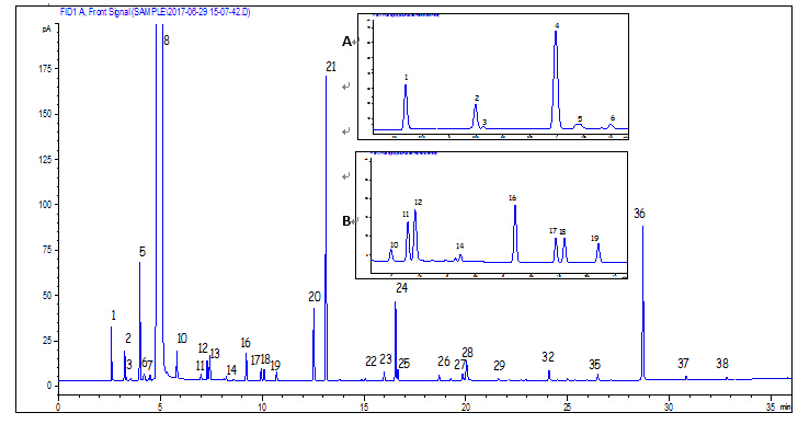 圖二 五*液(濃香型)樣品測(cè)試圖譜 (A)峰1-6放大圖 (B)峰10-19放大圖