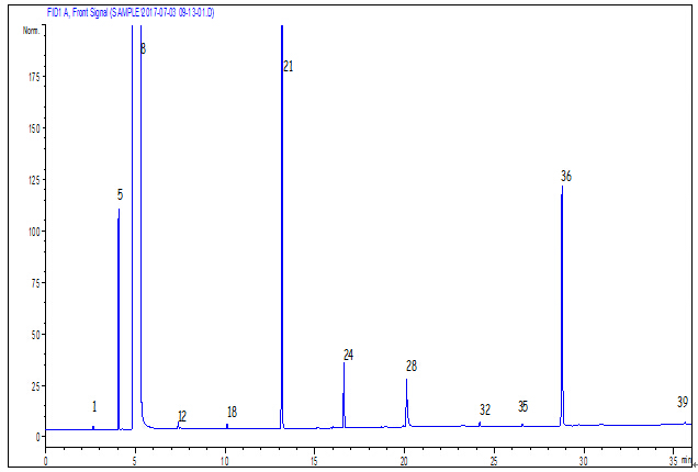 它的主體香源成分是己酸乙酯和丁酸乙酯。有機(jī)酸以乙酸和己酸為主,從圖譜中可以看出己酸的含量比其它香型酒要高出幾倍,其中乙酸含量在此酒中是要略高于己酸的,但由于乙酸在FID上響應(yīng)較弱,所以峰面積小。