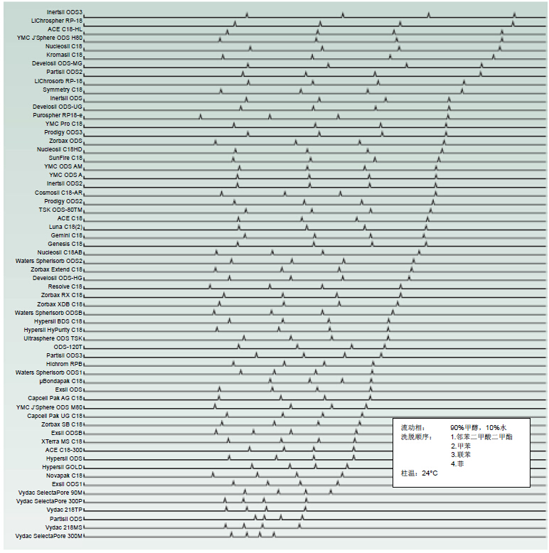 需要注意,依據(jù)對甲苯的保留順序列出的C18相與依據(jù)對菲的保留順序列出的C18相略有不同。