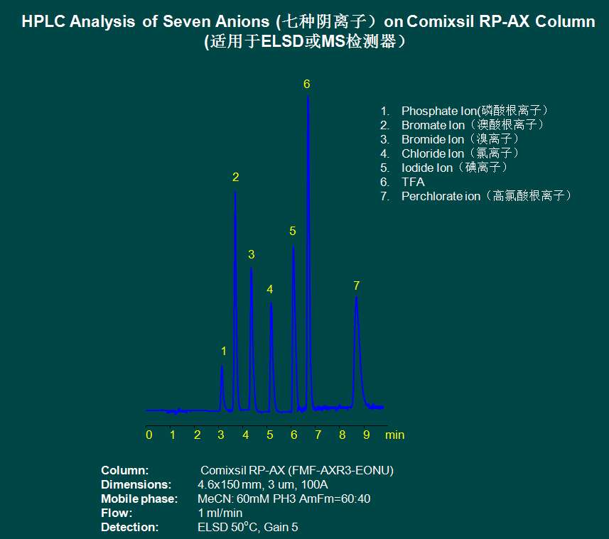 七種陰離子檢測(基因毒性和元素雜質(zhì)相關應用圖譜)菲羅門液相柱
