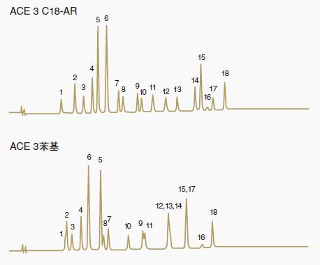 C18-AR可能具有其它不同的分離機制,可以為復(fù)雜的混合物帶來更好的分離效果。對于其他混合物,可能不是這種情況,這是ACE鍵合相的優(yōu)勢。