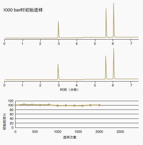 將2.1×100mm ACE Excel C18 UHPLC色譜柱在平均1,000 bar(14,500 psi)壓力下進(jìn)行2000多個梯度的運(yùn)行。